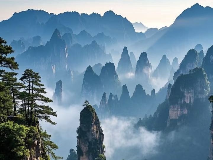 A breathtaking landscape of towering sandstone pillars, misty mountains, and the inspiration for the floating peaks in Avatar.
